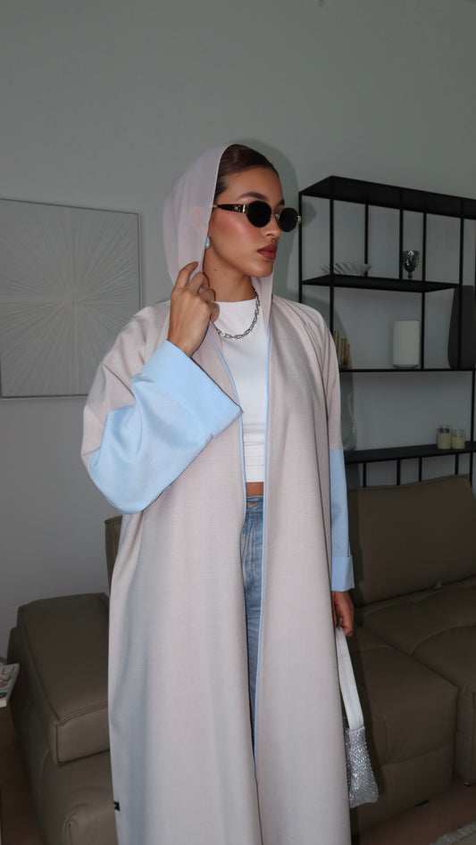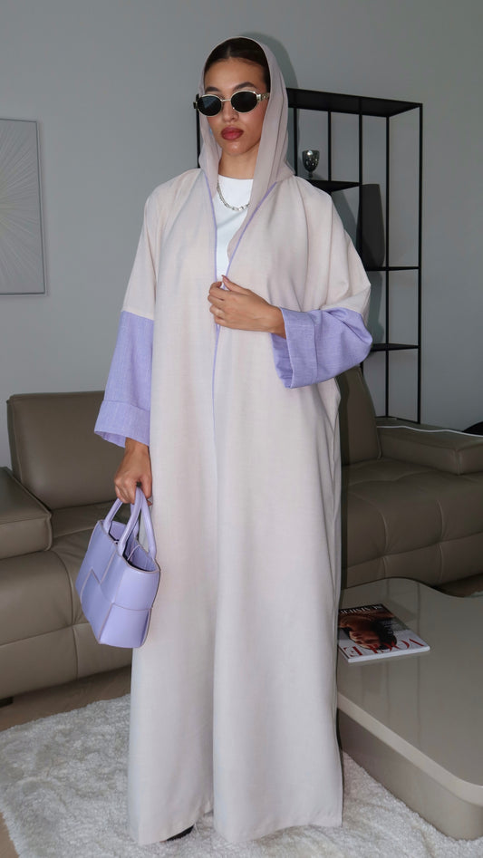 E68- Summery white and beige crepe abaya with lace ( A-line)