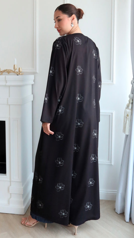 E67- Summery Black abaya with white floral handwork Crepe ( A- line)