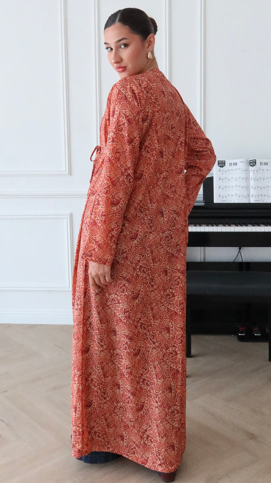 E58- Summery Orange palm tree abaya Crepe ( A - line )