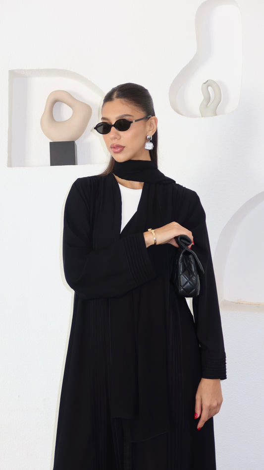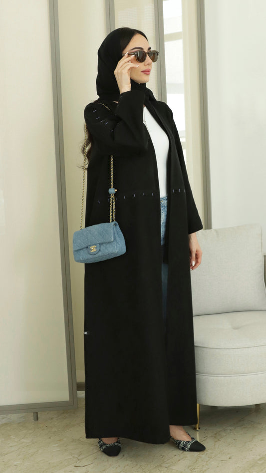 E63- Summery Waves front black abaya Crepe ( A - line )