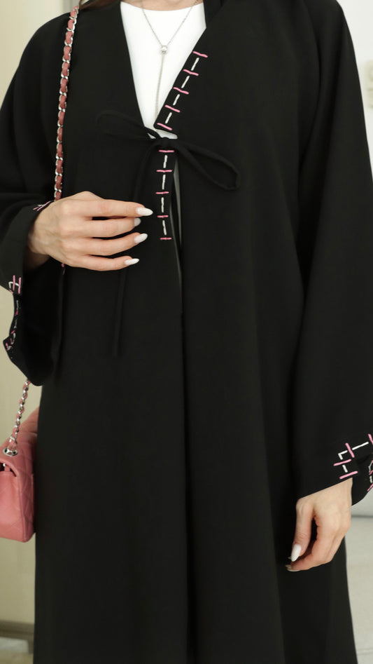 E67- Summery Black abaya with white floral handwork Crepe ( A- line)