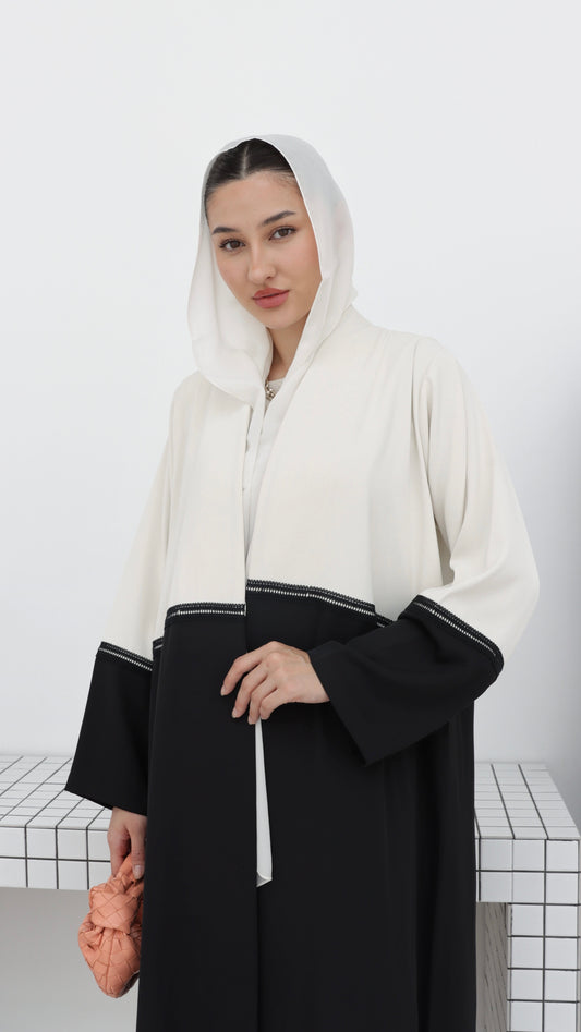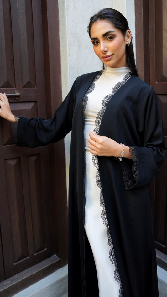 E68- Summery Black and white crepe abaya with lace ( A- line)