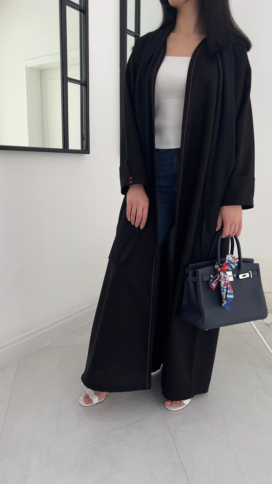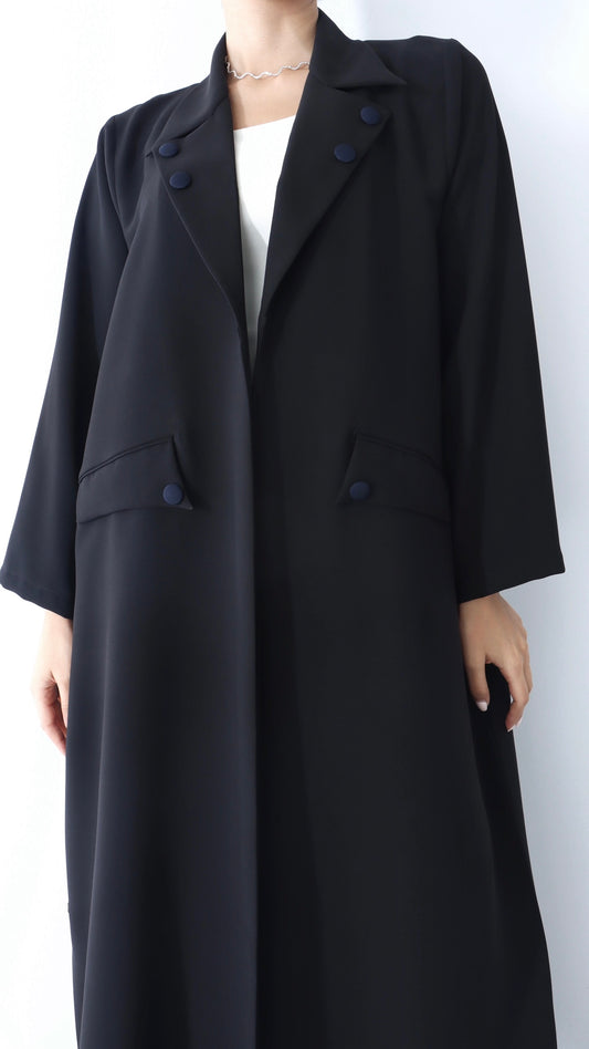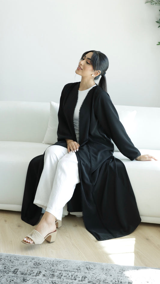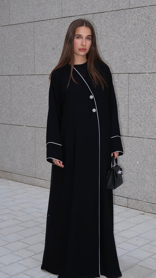 E62- Summery Black abaya with grey piping and buttons Crepe ( A - line )