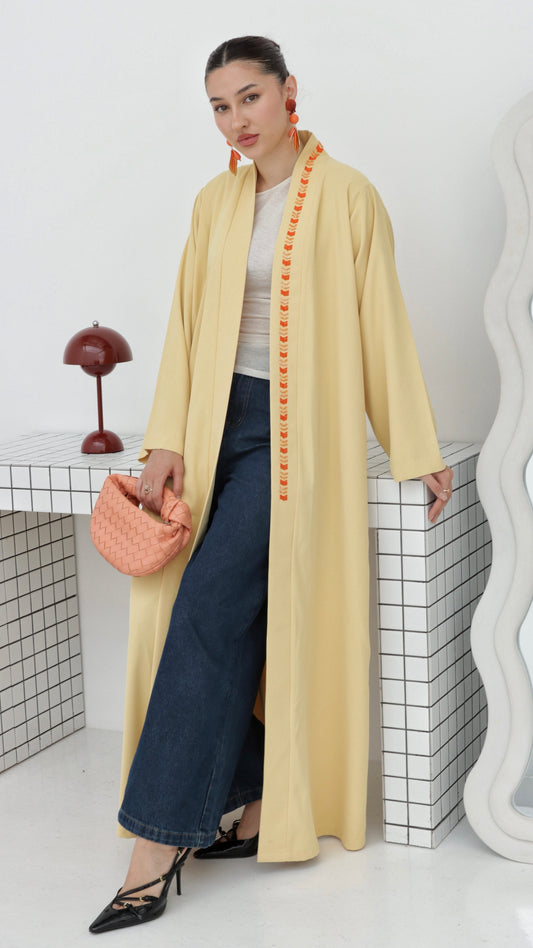 E69- Summery Butter Yellow crepe abaya with orange beads (A-line)