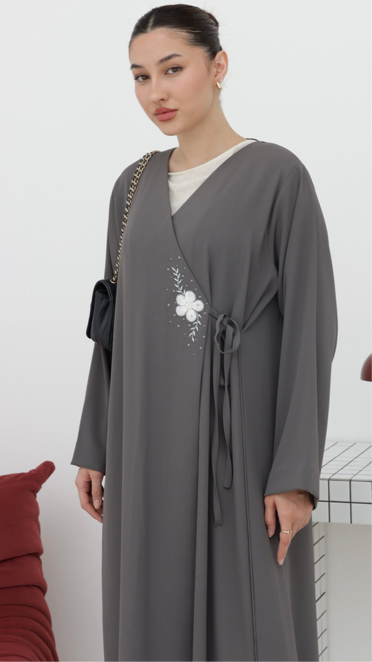 E67- Summery Grey abaya with white floral handwork Crepe ( A- line)